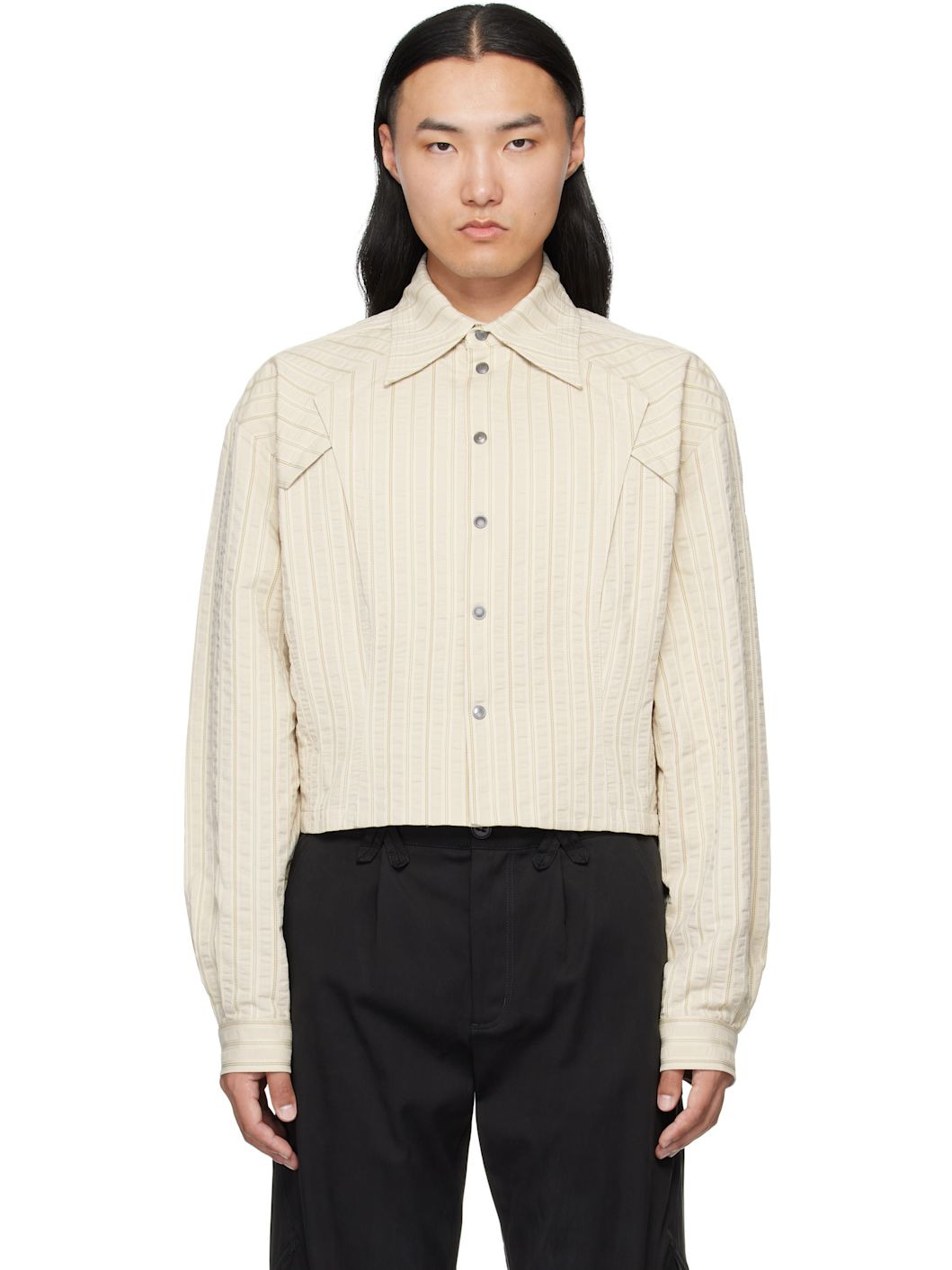 Woven cotton shirt. · Woven stripes throughout · Spread collar · Press-stud closure · Overlayed panels at front · Cropped hem · Adjustable press-stud cuffs Supplier color: Ivory Hunter Stripe 100% cotton. Made in Bulgaria 252985M192005