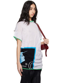Semi-sheer and crinkled knit cotton-blend T-shirt. Metallic thread detailing throughout. · Asymmetrical construction · Rib-knit trim at mock neck, hem, and cuffs · Intarsia graphic at front · Dropped shoulder · Cap sleeves Supplier color: Star white/Night scape intarsia Body 1: 72% cotton, 28% metalized fibre. Body 2: 83% viscose, 17% polyester. Made in Italy 251985F096001