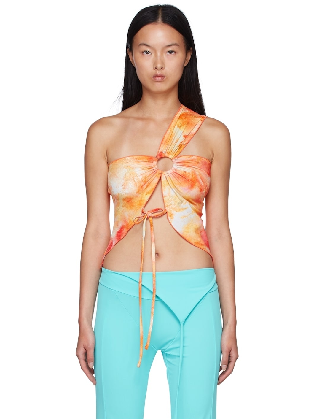 Stretch nylon jersey cover up. Graphic pattern printed throughout. · Asymmetric construction · Gathering and O-ring hardware at chest · Self-tie fastening at front Available exclusively at SSENSE. Supplier color: Orange print 82% nylon, 18% spandex. Made in China 222777F102001