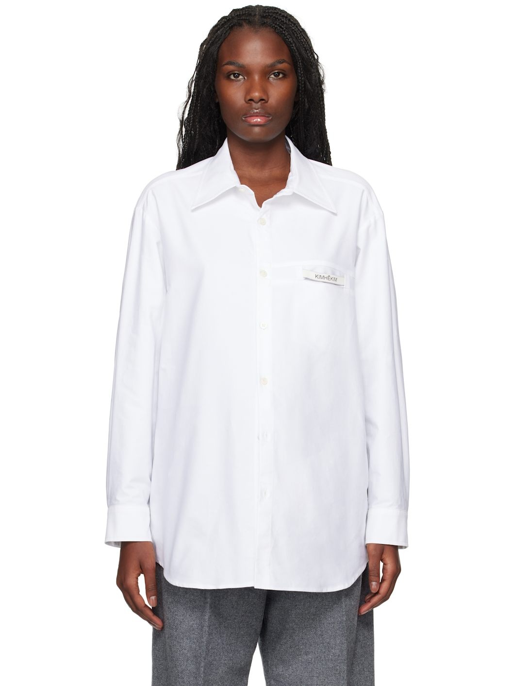 Oversized cotton Oxford cloth shirt. · Spread collar · Button closure · Logo patch at welt pocket · Shirttail hem · Two-button barrel cuffs Supplier color: White 100% cotton. Made in South Korea 242609F109000