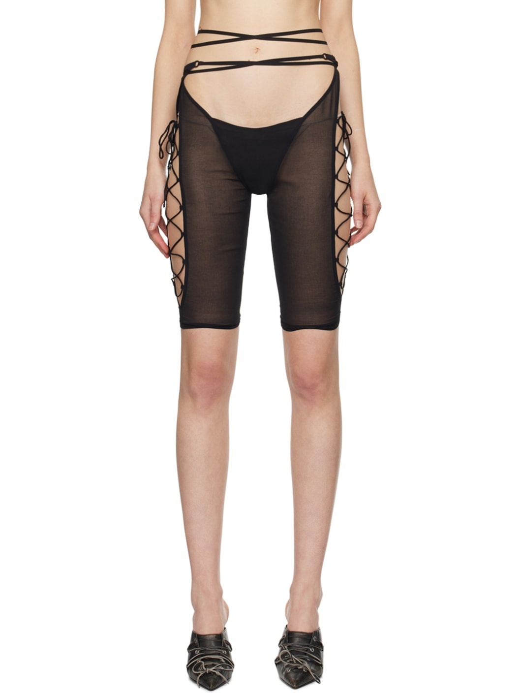 Semi-sheer stretch silk chiffon shorts. · Self-tie fastening and O-ring hardware at waistband · Cutout and lace-up drawstring at outseams · Concealed zip closure at back · Partial stretch silk chiffon lining Supplier color: Black 98% silk, 2% elastane. Made in United Kingdom 241148F088004