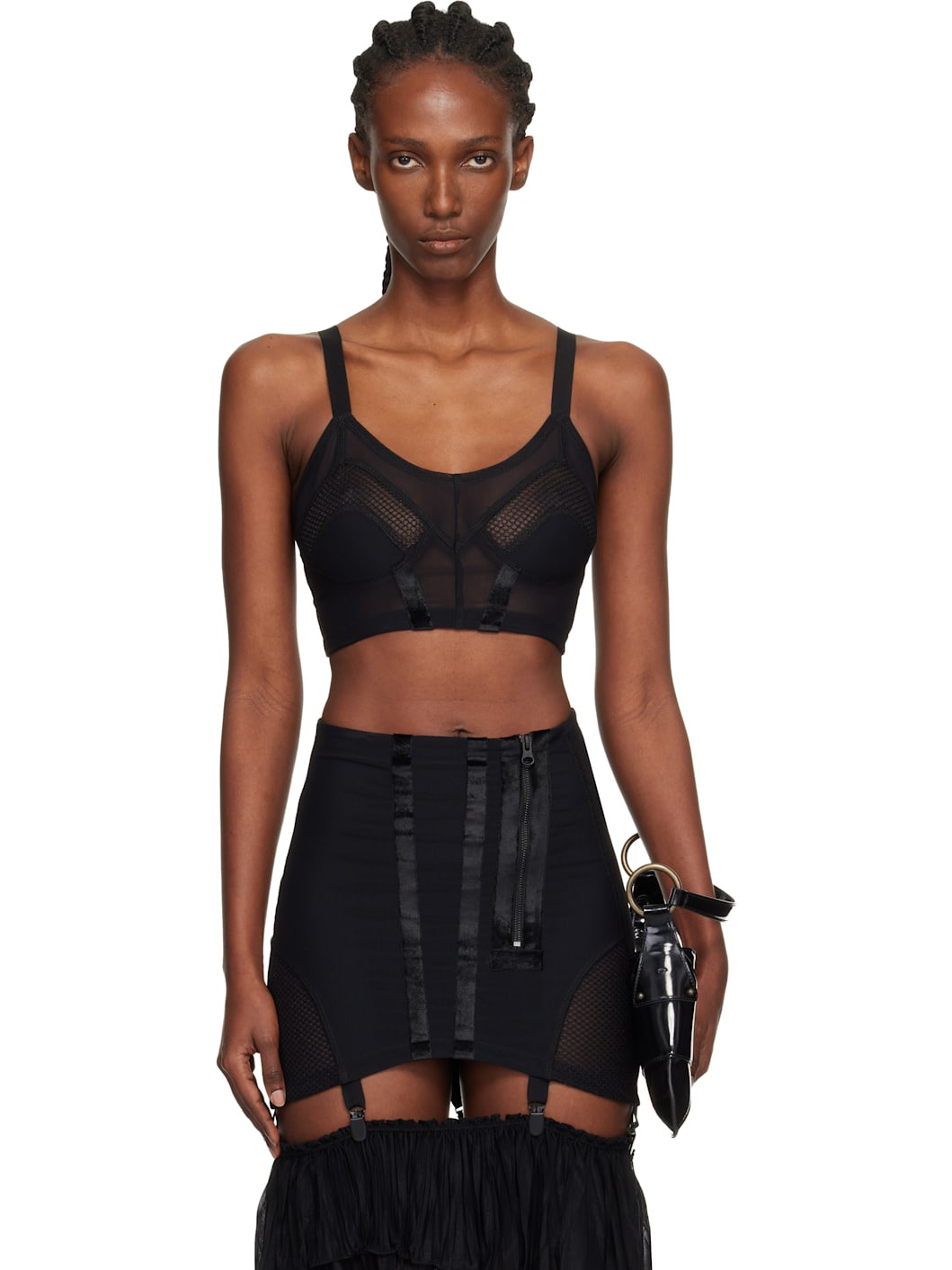 Sheer stretch nylon mesh bra. · Scoop neck · Adjustable elasticized shoulder straps · Zip closure Supplier color: Black Body: 83% nylon, 17% polyurethane. Trim 1: 55% polyethylene, 40% cotton, 5% polyurethane. Trim 2: 75% polyamide, 25% elastane. Made in United Kingdom 252148F111000
