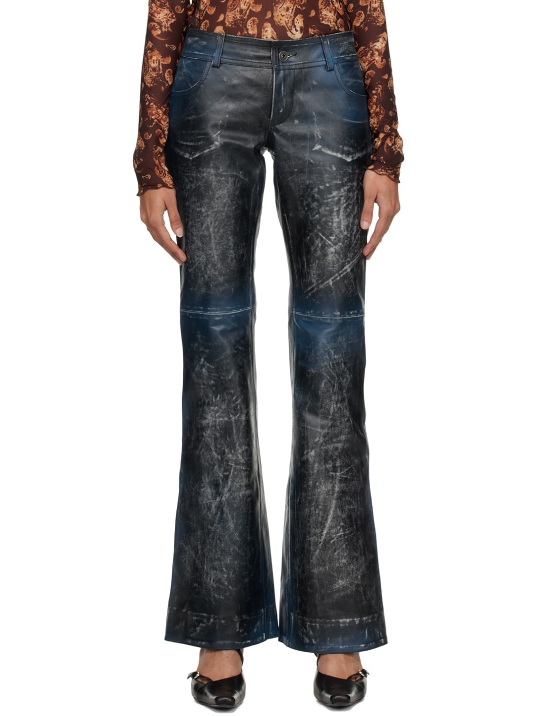 Color treated buffed leather pants. Fading and distressing throughout. · Paneled construction · Low-rise · Belt loops · Four-pocket styling · Zip-fly · Flared cuffs · Full polyester satin lining · Gunmetal-tone hardware Supplier color: Blue wash
