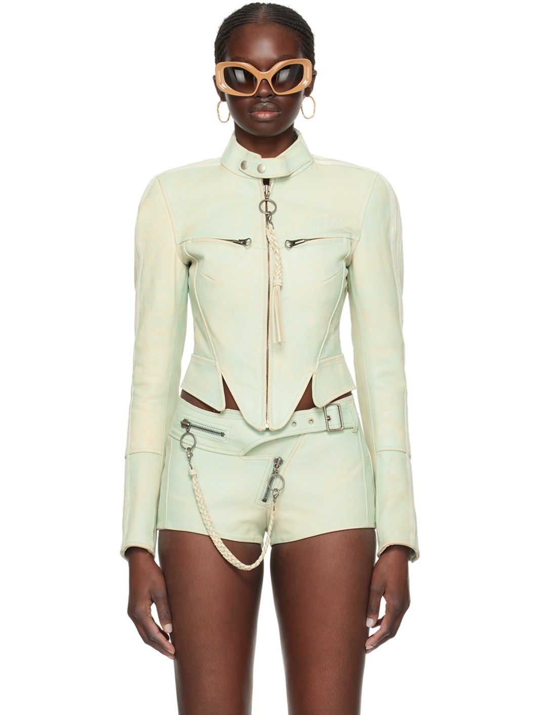 Cracked lambskin jacket. Fading and distressing throughout. · Adjustable press-stud tab at band collar · Detachable braided tassel at zip closure · Logo embossed at chest · Zip pockets · Twin vents at asymmetric hem · Padded shoulders · Striped suede trim at sleeves · Zip vent at cuffs · Full cupro satin lining Supplier color: Moto teal Body: 100% lambskin. Lining: 100% cupro. Made in Italy 241148F064002