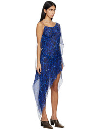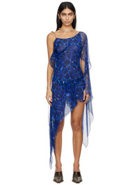 Handcrafted silk crepon dress. Graphic pattern printed throughout. · Asymmetric, layered, and draped construction · Cord-lock spaghetti strap Supplier color: Aqua leo