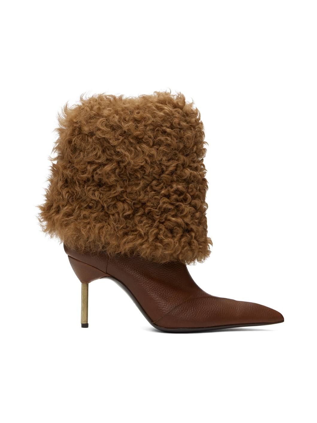 Ankle-high pebble grained calfskin boots in brown. · Pointed toe · Lamb fur trim at foldover collar · Metal stiletto heel with rubber injection · Leather sole · Antiqued brass-tone hardware · Heel: H3.75" Supplier color: Auburn Upper: calfskin. Sole: leather, rubber. Made in Italy 242148F113002