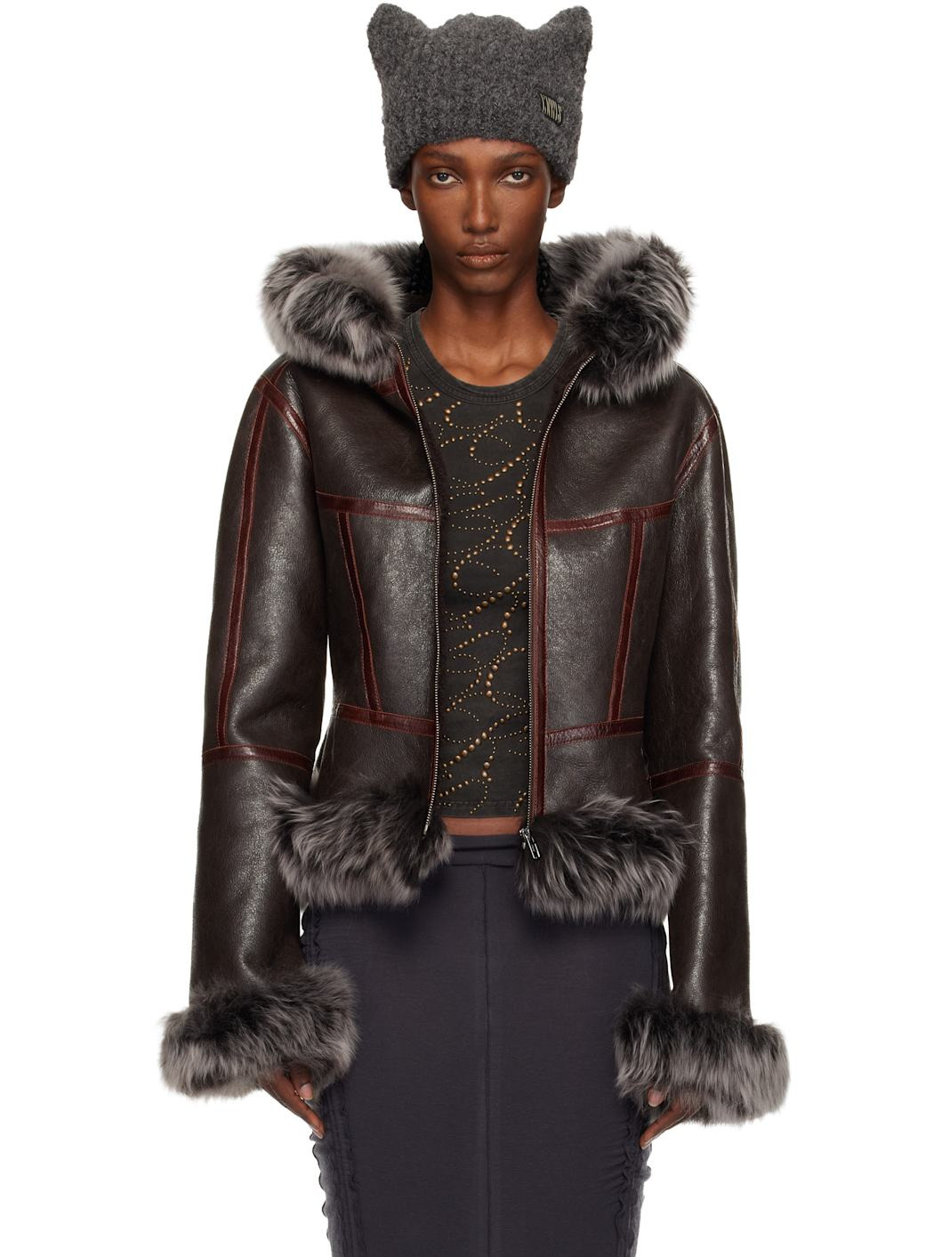 Grained lambskin jacket. · Fading throughout · Shearling trim at hood, hem, and cuffs · Zip closure · Full sherpa fleece lining Supplier color: Brown Body: 100% lambskin. Trim: 100% lambskin. Lining: 100% acetate. Made in Turkey 252148F062000