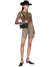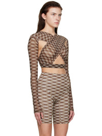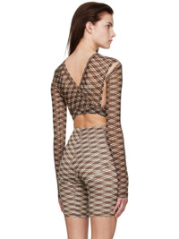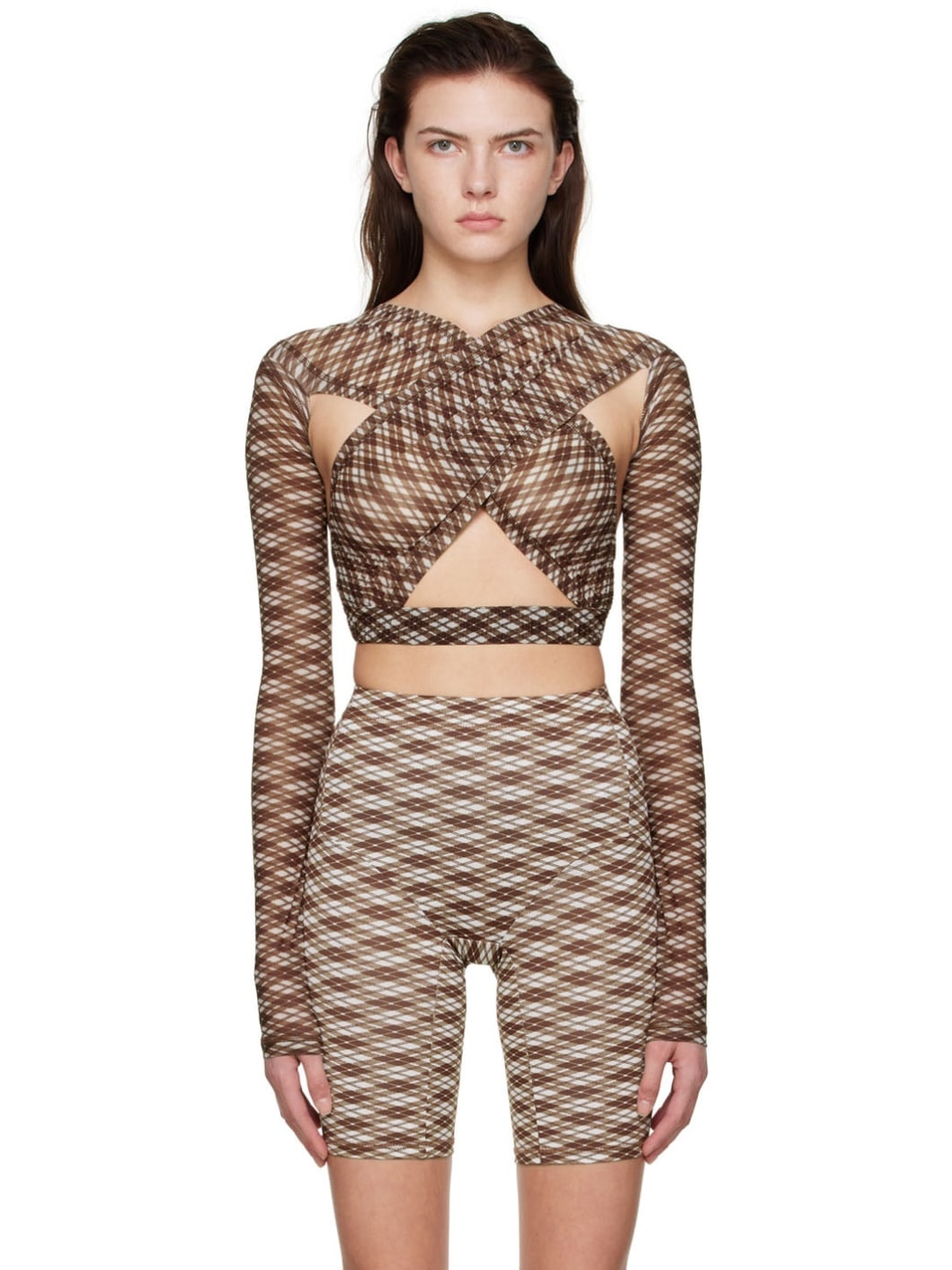 Semi-sheer stretch polyester mesh blouse. Cut-outs and check pattern printed throughout. · V-neck · Cross-over shoulders · Elasticized hem · Layered construction · Unlined Supplier color: Argyle k 75% polyester, 25% elastane. Made in Italy 221148F107003