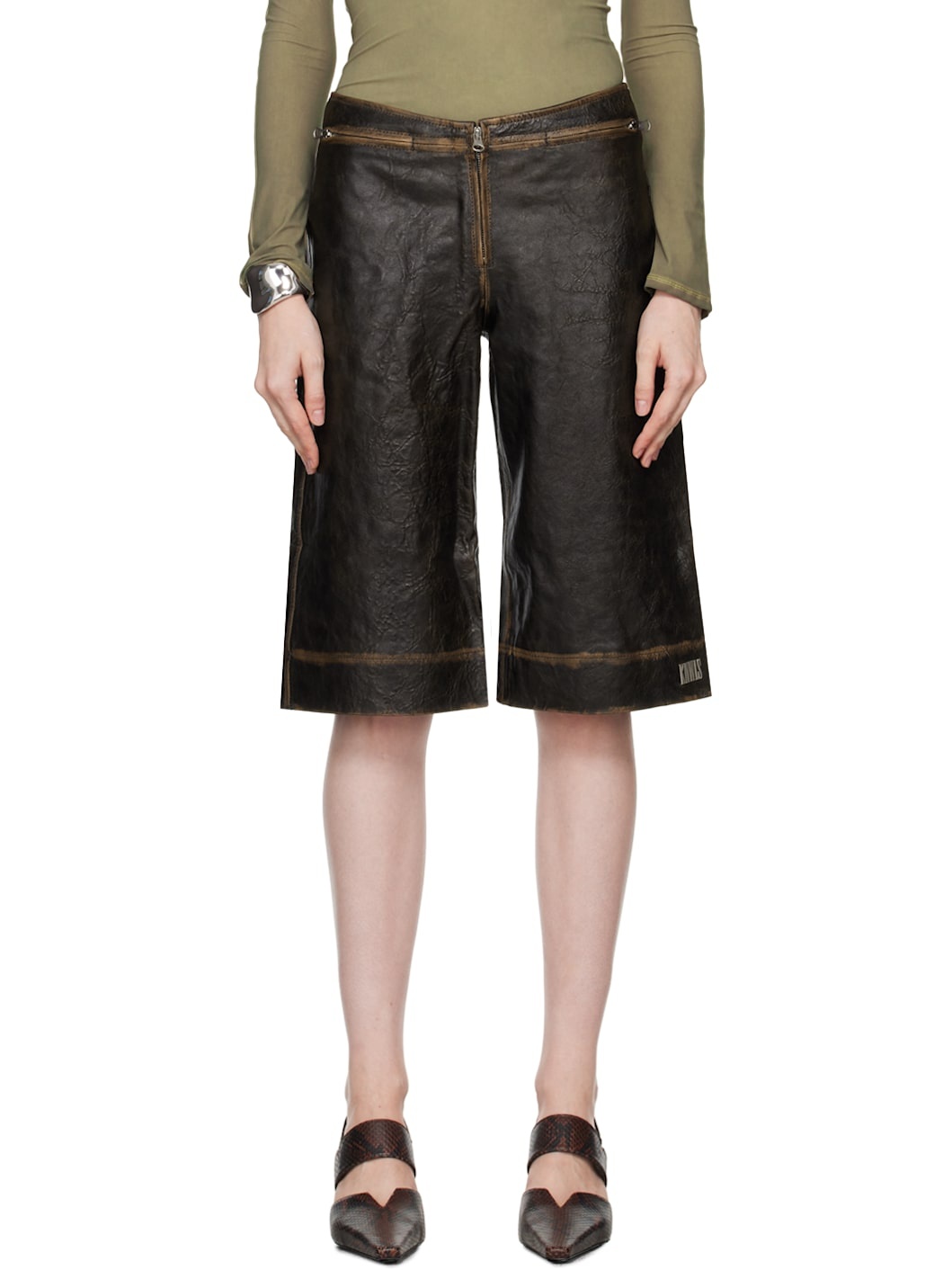 Loose-fit grained lambskin shorts. Faded edges throughout. · Low-rise · Four-pocket styling · Exposed zip-fly · Logo hardware at cuff · Full viscose-blend twill lining Supplier color: Brown Body: 100% lambskin. Lining: 52% viscose, 48% cotton. Made in Italy 242148F088001