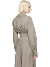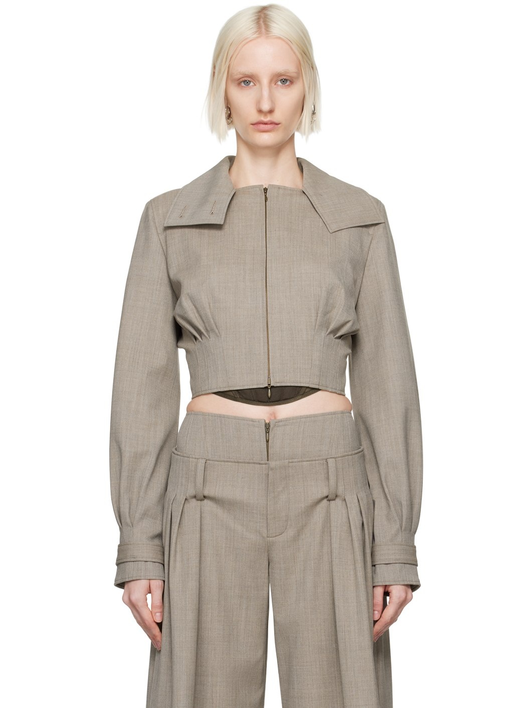 Wool sharkskin jacket. · Funnel neck converts to spread collar · Button fastenings at collar · Two-way zip closure · Pleats at cropped hem · Padded shoulders · Loop and detachable button tab at cuffs · Full viscose-blend twill lining Supplier color: Grey Body: 100% wool. Lining: 52% viscose, 48% cotton. Made in United Kingdom 242148F063000