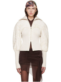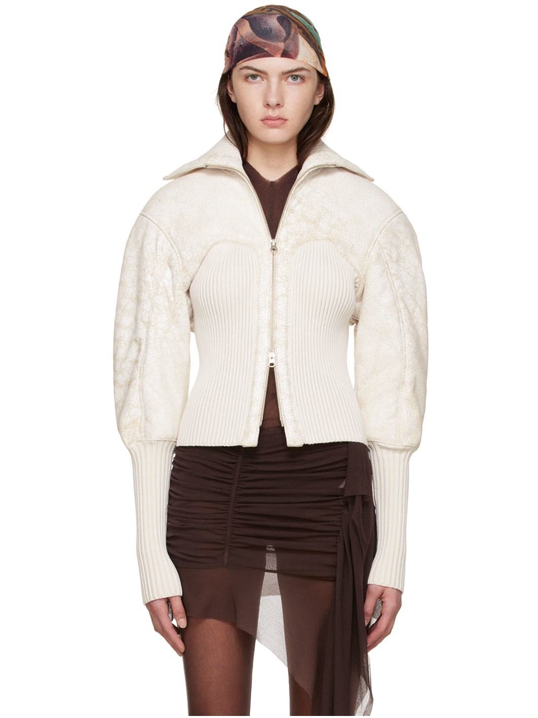 Insulated paneled lambskin and rib knit stretch viscose jacket. Distressing throughout. · Spread collar · Two-way zip closure · Partially lined Supplier color: Crackled white Body 1: 100% lambskin. Body 2: 50% viscose, 50% elastane. Fill: 100% recycled polyester. Lining 1: 52% viscose, 48% cotton. Made in United Kingdom 221148F064001