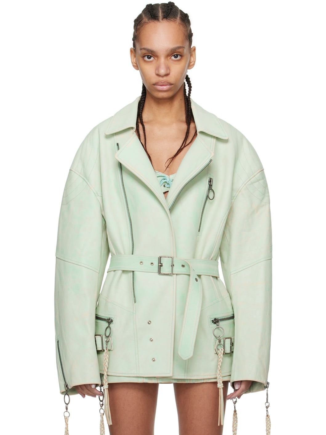 Grained leather jacket. Distressing throughout. · Spread collar · Offset zip closure with partial press-stud placket · Zip and welt pockets · Belt loops and pin-buckle belt at waist · Pin-buckle strap at side seams · Quilted shoulders · Logo embossed at sleeve · Zip vent at cuffs · Full satin lining Available exclusively at SSENSE. Supplier color: Moto teal Body: 100% leather. Lining: 68% acetate, 32% polybutylene terephthalate. Made in Italy 241148F064005