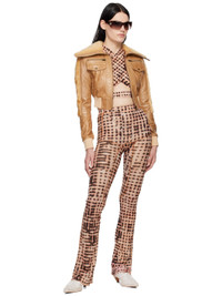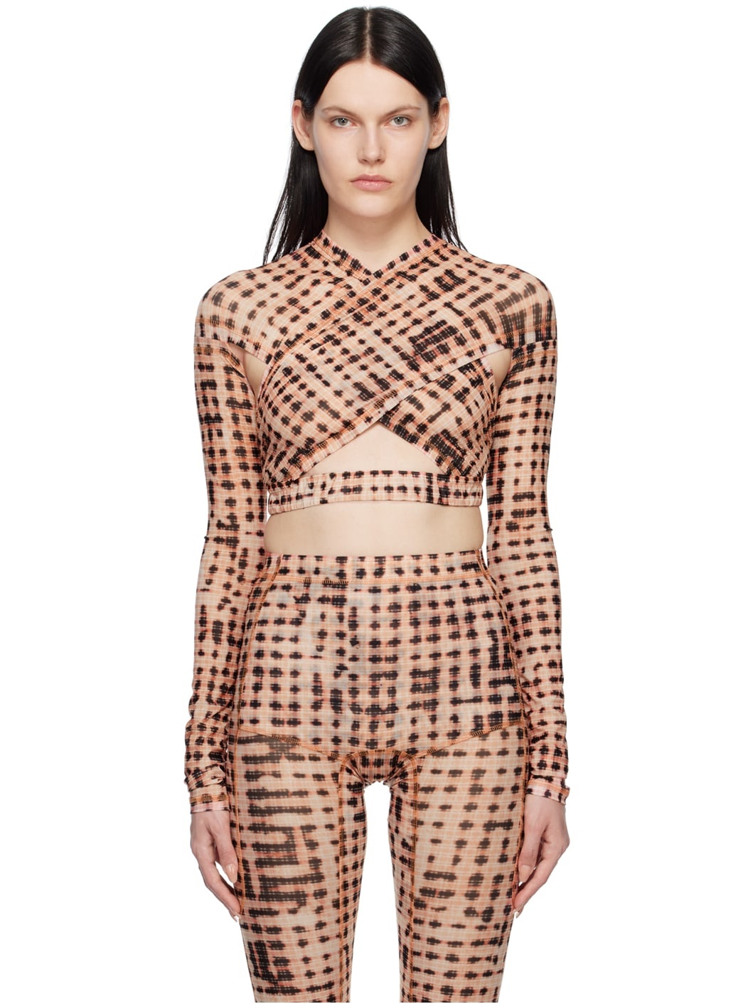 Semi-sheer stretch polyester jersey bustier-style blouse. Modified plaid pattern printed throughout. · Layered and wrap construction · V-neck · Cutout at armscyes and elasticized cropped hem Available exclusively at SSENSE. Supplier color: Bleach plaid pink 84% polyester, 16% elastane. Made in Italy 231148F107000