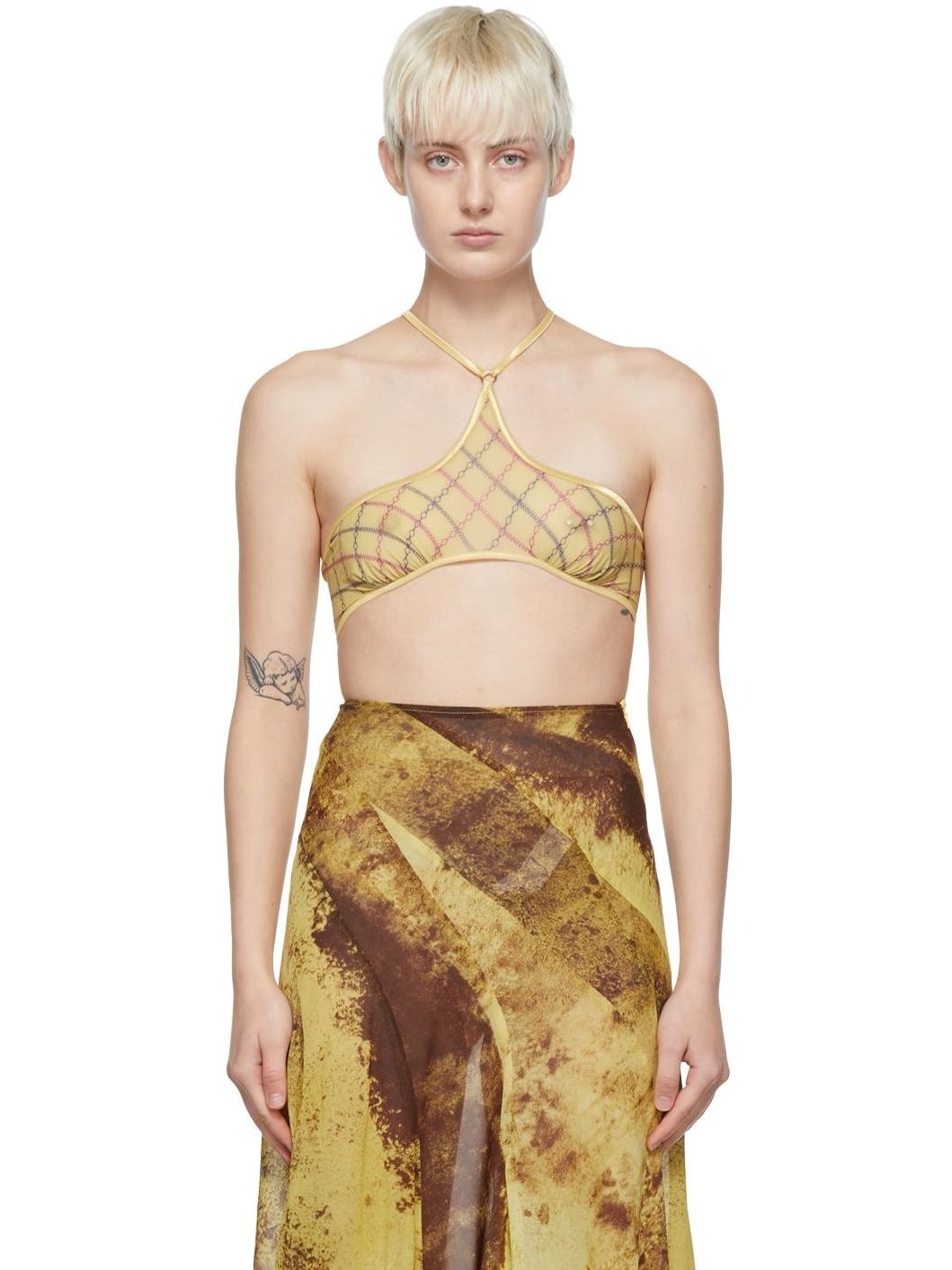 Stretch polyester mesh bra. · Fixed halter straps · Graphic pattern printed throughout Available exclusively at SSENSE. Supplier color: Yellow chain argyle 75% polyester, 25% elastane. Made in United Kingdom 221148F073003