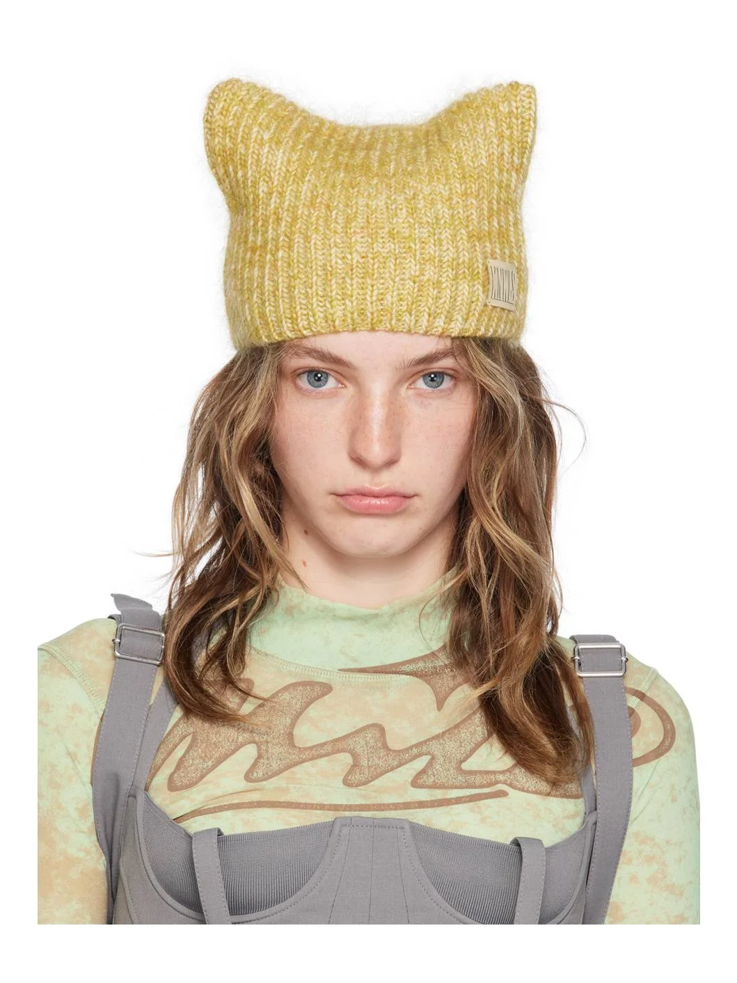 Handcrafted rib knit wool- and mohair-blend beanie in yellow. · Modified crown · Rubberized logo patch at face Supplier color: Yellow