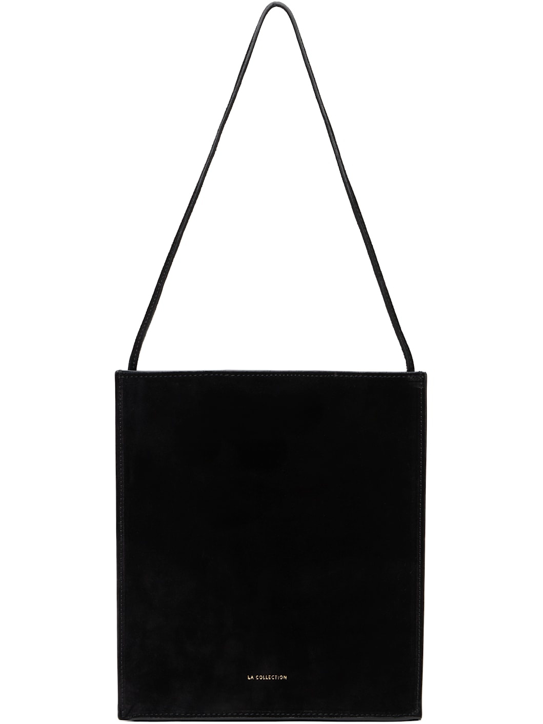 Calfskin suede shoulder bag in black. · Fixed shoulder strap · Logo stamp at face · Magnetic closure · Suede lining · H9" x W8.25" x D1.75" Supplier color: Black Calfskin. Made in Italy 251190F048077