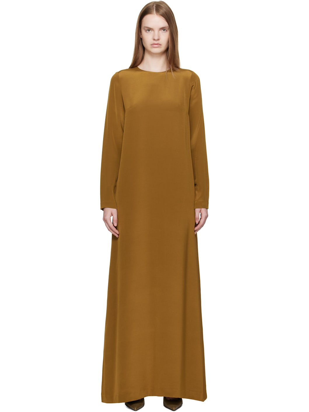 Silk crepe maxi dress. · Round neck · Darts at chest · Button fastening and keyhole at back collar · Central vent at back hem · Full silk satin lining Supplier color: Bronze 100% silk. Made in Hungary 252190F055000