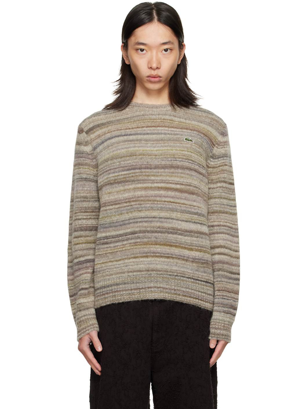 Brushed knit wool- and alpaca-blend sweater. · Rib-knit crewneck, cuffs, and hem · Embroidered logo patch at chest Supplier color: Silver chine/Opium 63% wool, 20% nylon, 17% alpaca. Made in Romania 252268M201002