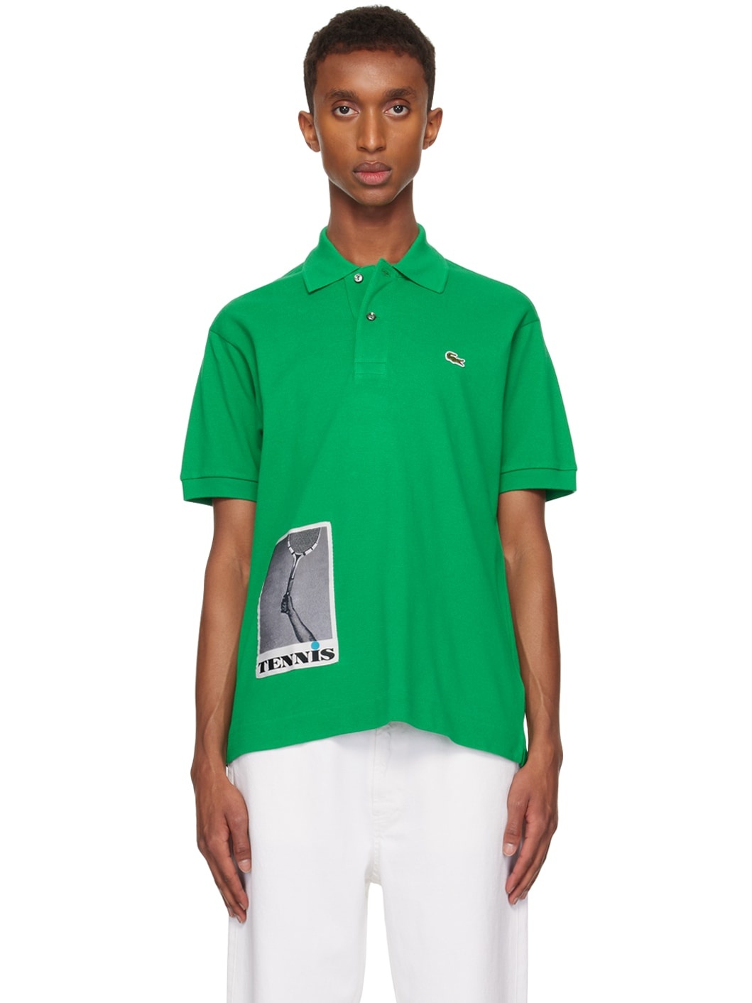 Cotton pique polo. · Rib-knit spread collar and cuffs · Mother-of-pearl two-button placket · Embroidered logo at chest · Graphic patch at front hem · Tennis-tail hem Supplier color: Green Body: 100% cotton. Trim: 99% cotton, 1% elastane. Made in Turkey 242268M213030