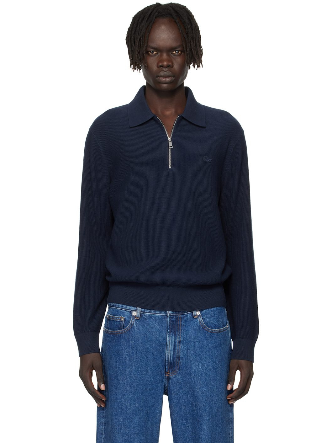 14-gauge knit cotton- and wool-blend polo. · Rib-knit spread collar, hem, and cuffs · Half-zip closure · Embroidered logo patch at chest Part of the Paris collection. Supplier color: Navy blue Body: 80% cotton, 20% wool. Trim: 72% cotton, 20% wool, 6% polyamide, 1% polyester, 1% elastane. Made in Viet Nam 252268M212011