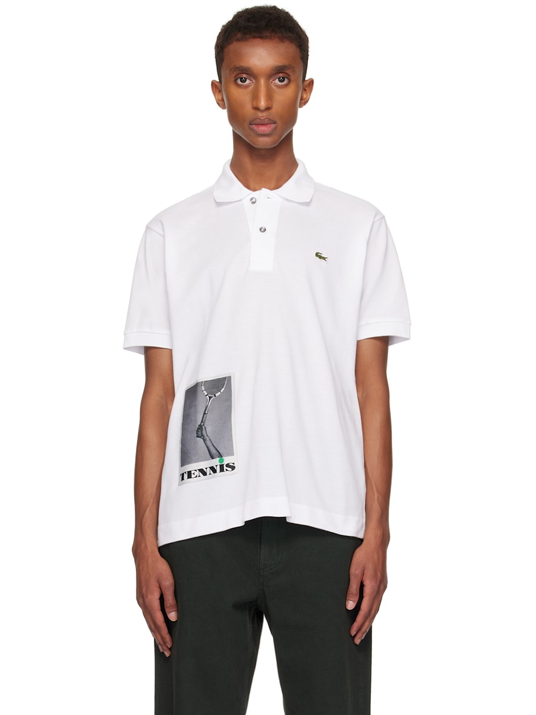 Cotton pique polo. · Rib-knit spread collar and cuffs · Mother-of-pearl two-button placket · Embroidered logo at chest · Graphic patch at front hem · Tennis-tail hem Supplier color: White Body: 100% cotton. Trim: 99% cotton, 1% elastane. Made in Turkey 242268M213029