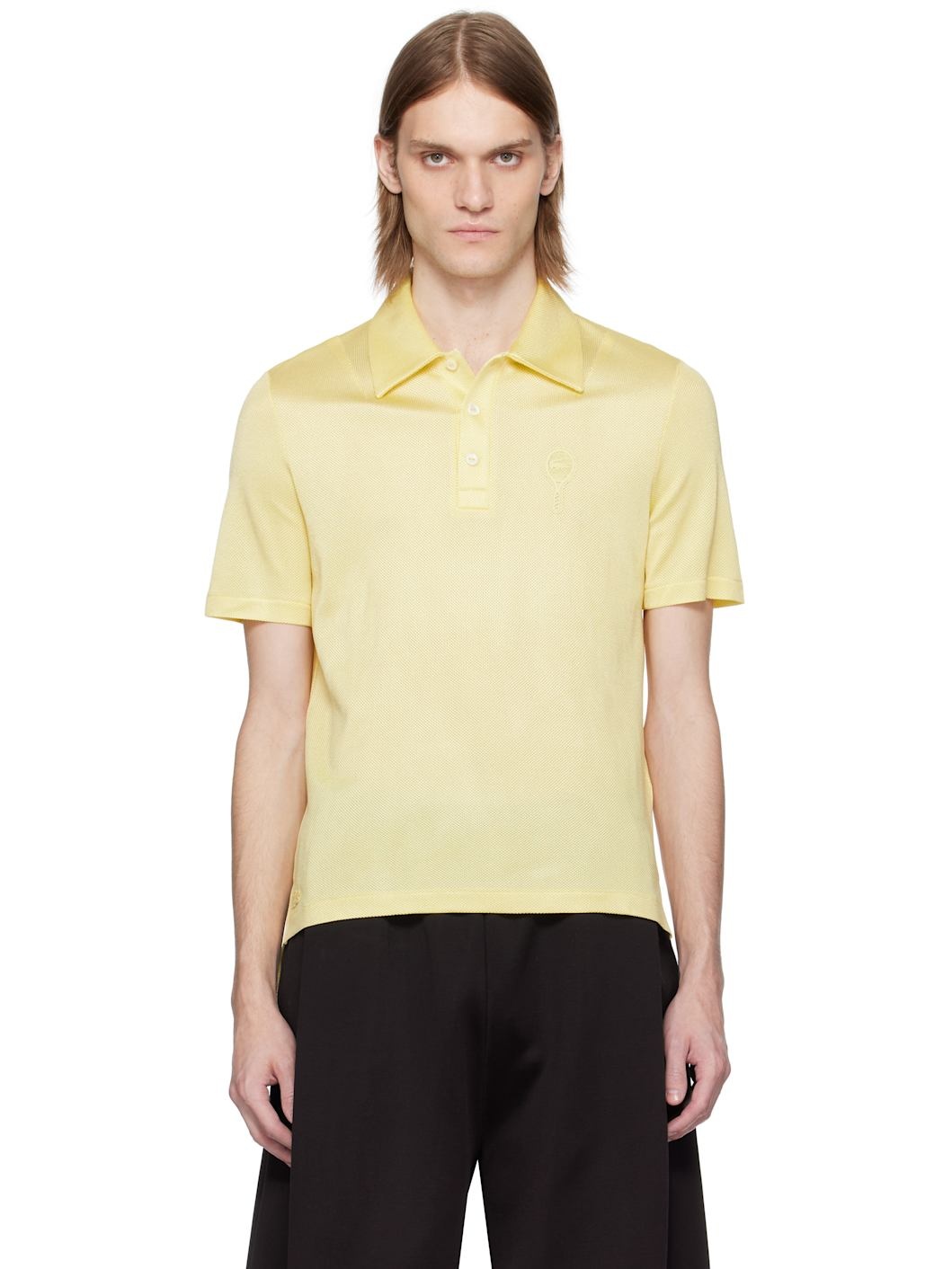 Semi-sheer stretch rayon pique polo. · Lightweight · Spread collar · Three-button placket · Embroidered logo patch at chest and front hem · Droptail hem · Mother-of-pearl hardware Supplier color: Pastel yellow 98% rayon, 2% elastane. Made in Slovakia (Slovak Republic) 251268M212038