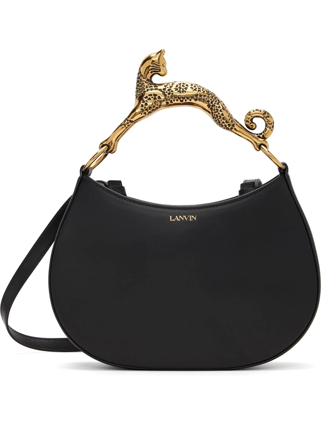 Structured buffed calfskin top handle bag. · Sculptural brass carry handle · Adjustable and detachable crossbody strap · Logo stamp at face · Magnetic tab at open throat · Zip pocket and card slot at interior · Calfskin suede lining · H9" x W10" x D2.5" Supplier color: Black Calfskin. Made in Italy 252254F046004