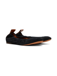 Calfskin suede ballerina flats in black. · Elasticized collar · Logo-embossed pull-loop at heel · Buffed calfskin and goatskin suede lining · Logo patch at padded leather footbed · Suede sole with rubber injection Supplier color: Black Upper: 100% calfskin. Sole: 100% leather. Made in Italy 242254F118018
