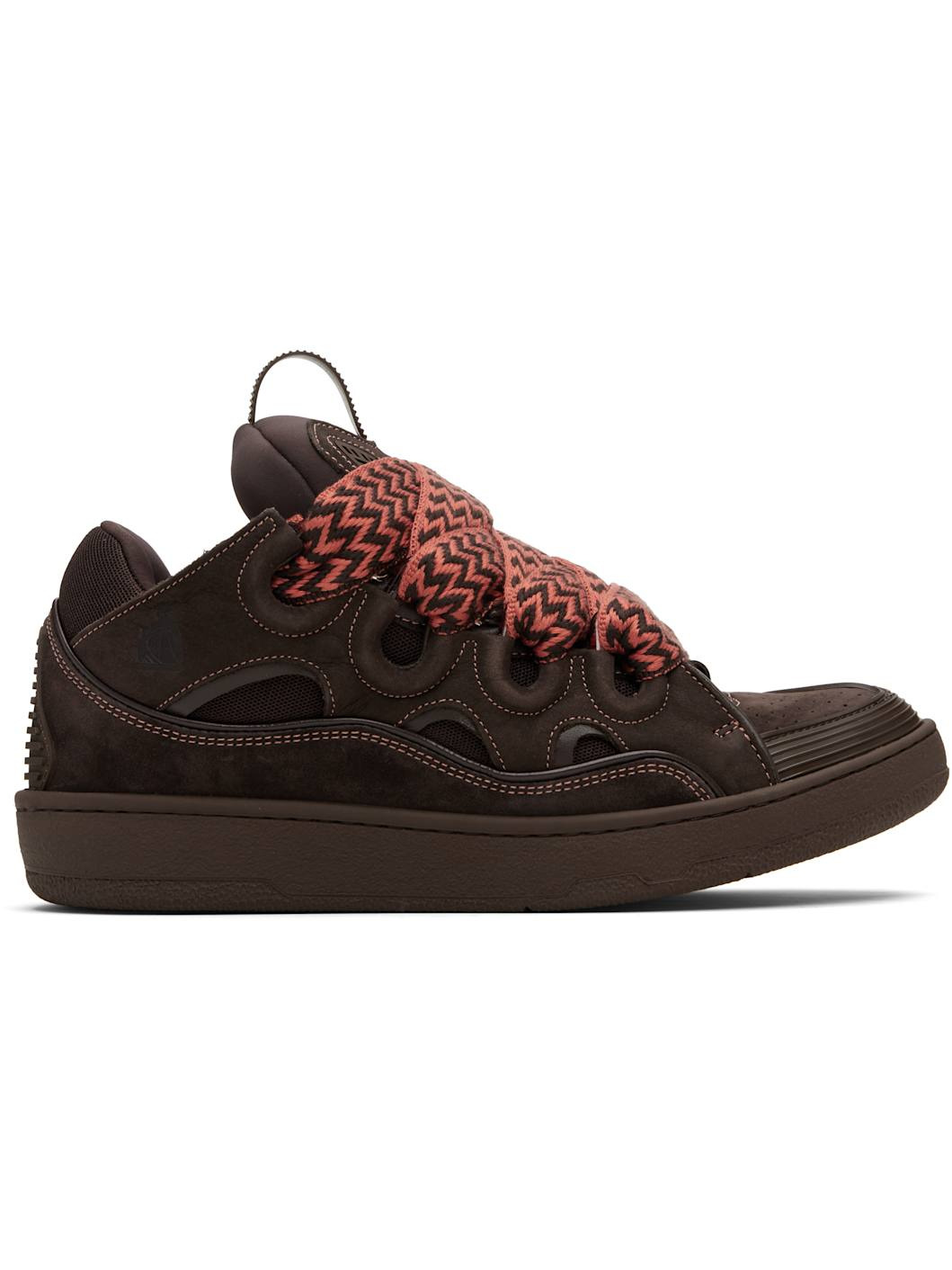 Low-top calfskin suede, grained calfskin, and mesh sneakers. · Piping, cutouts, and rubberized trim throughout · Perforations at toe · Logo embossed at toe and outer side · Lace-up closure · Logo plaque and pull-loop at tongue · Padded tongue and collar · Jersey lining · Treaded rubber sole Supplier color: Dark brown Upper: calfskin, textile. Sole: rubber. Made in Portugal 251254M237073