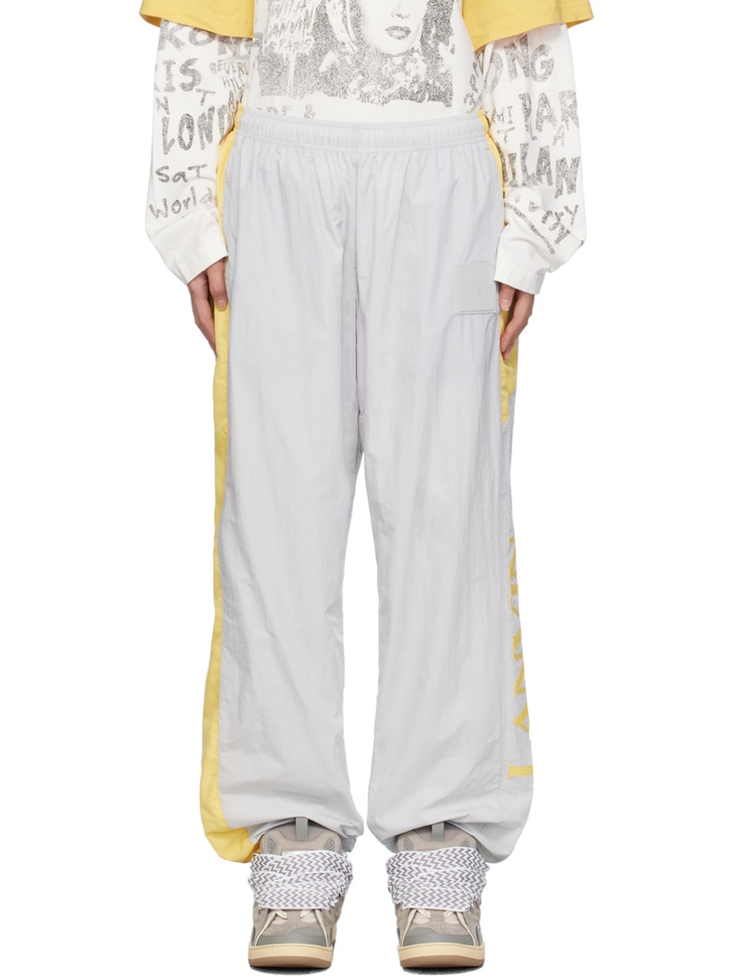 Loose-fit nylon taffeta track pants. · Concealed drawstring at elasticized waistband · Two-pocket styling · Rubberized logo patch at front · Zip vent at elasticized cuffs · Polyester taffeta stripe at outseams · Logo appliques at outseam · Full mesh lining · Logo-engraved silver-tone hardware Part of the Lanvin x Future collaboration, within the Lanvin Lab collection. Supplier color: Eagle grey Body 1: 100% polyamide. Body 2: 100% polyester. Lining: 100% polyester. Made in Italy 241254F086003