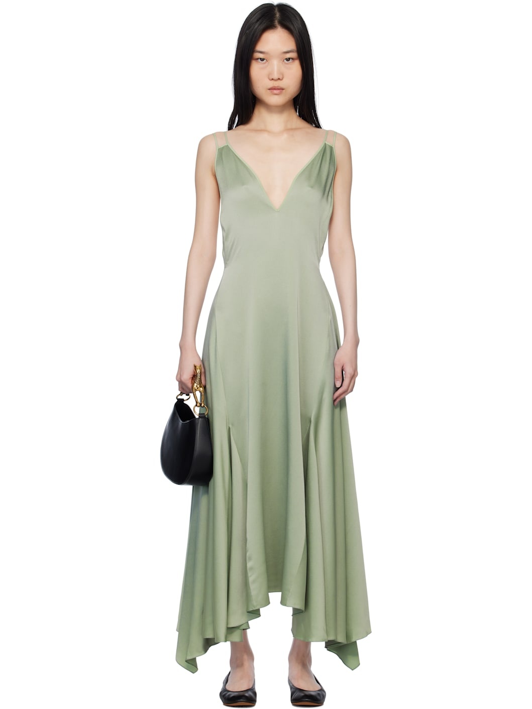 Silk satin midi dress. · Plunging V-neck · Godet panels at handkerchief hem · Fixed spaghetti straps · Zip closure at low back · Full acetate- and silk-blend crepe lining Supplier color: Vert de gris Body: 100% silk. Lining: 73% acetate, 27% silk. Made in Spain 251254F054000