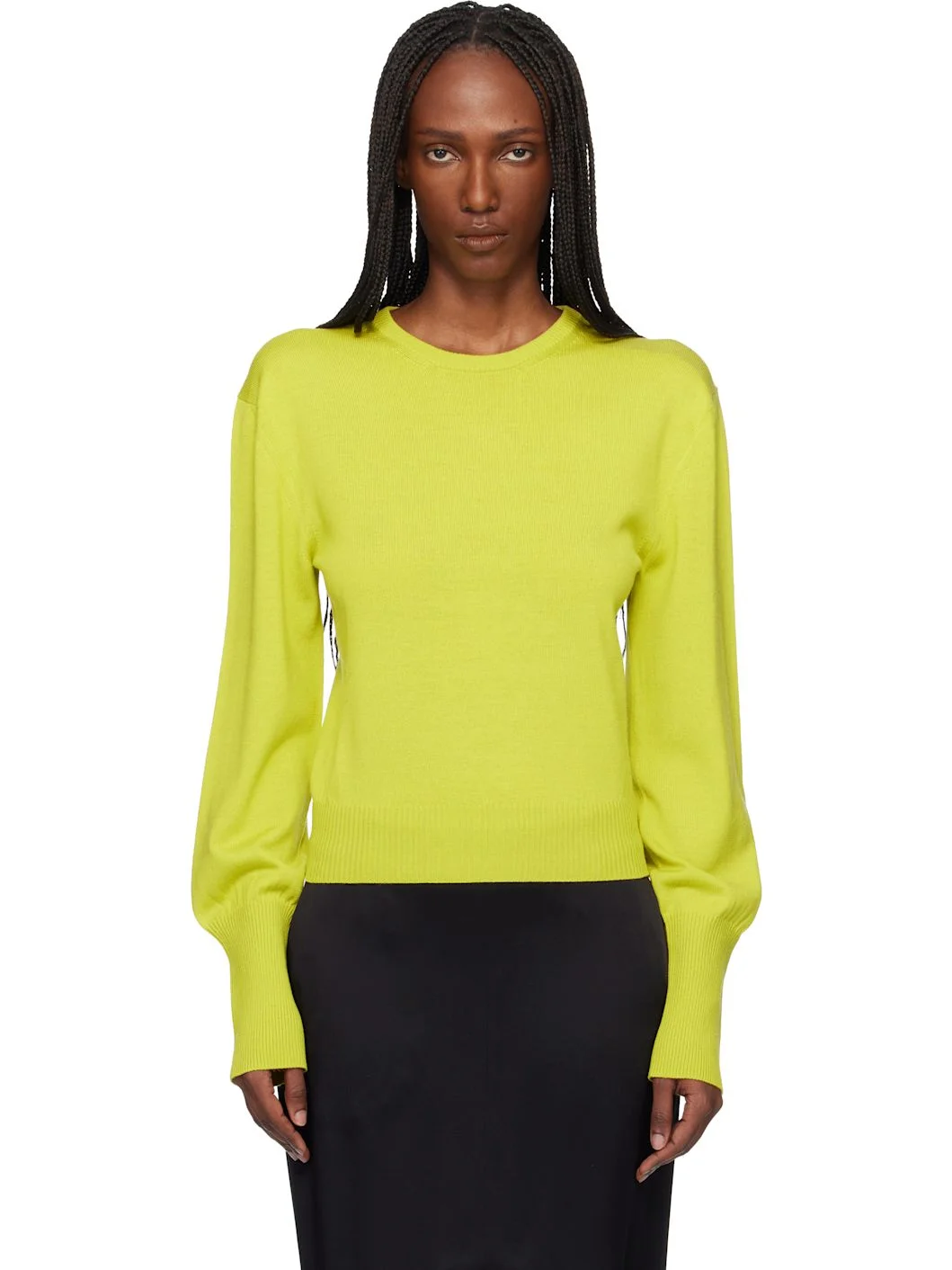 Knit stretch wool-blend sweater. · Rib-knit crewneck, hem, and cuffs · Grosgrain self-tie fastening at back collar Supplier color: Absinth green Body: 97% wool, 2% polyamide, 1% elastane. Trim: 100% rayon. Made in Italy 261254F096001
