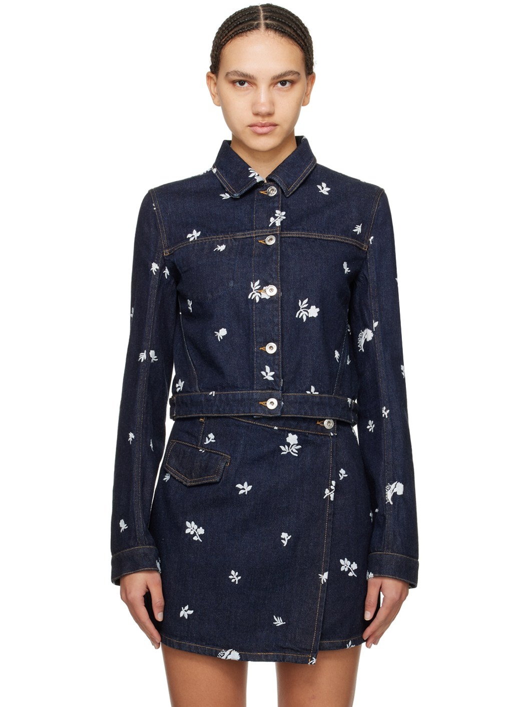 Non-stretch denim jacket. Graphic pattern embroidered throughout. · Spread collar · Button closure · Single-button barrel cuffs · Adjustable button tabs at back hem · Embroidered logo patch at back hem · Logo-engraved silver-tone hardware · Contrast stitching in tan Supplier color: Navy blue Body: 100% cotton. Trim: 100% polyester. Made in Italy 241254F060000