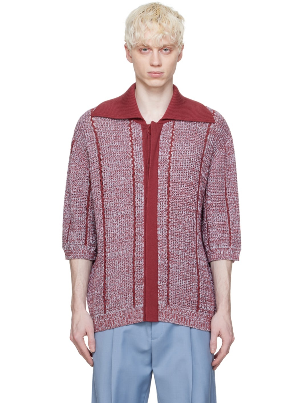 Crocheted cotton- and virgin wool-blend polo. · Rib knit spread collar, placket, hem, and cuffs · Concealed button closure · Dropped shoulders · Logo-engraved corozo hardware Supplier color: Red/Multi 55% cotton, 45% virgin wool. Made in Italy 241254M212004
