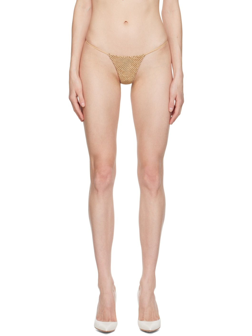 Stretch polyester mesh thong. Crystal-cut detailing throughout. · Partially elasticized waistband · Full stretch mesh lining Supplier color: Gold Body: 93% polyester, 7% spandex. Lining: 90% nylon, 10% spandex. Made in United States 222779F081000