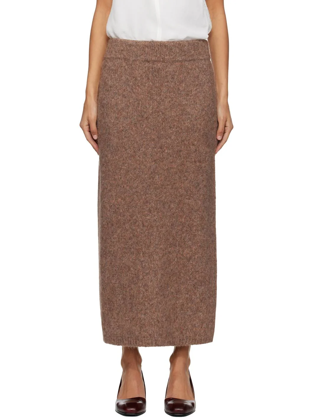 Brushed knit suri alpaca- and pima cotton-blend midi skirt. · Hand-loomed · Elasticized waistband · Rib-knit hem · Central vent at back hem Supplier color: Spice 48% suri alpaca, 31% pima cotton, 21% fine merino wool. Made in Peru 252874F092001