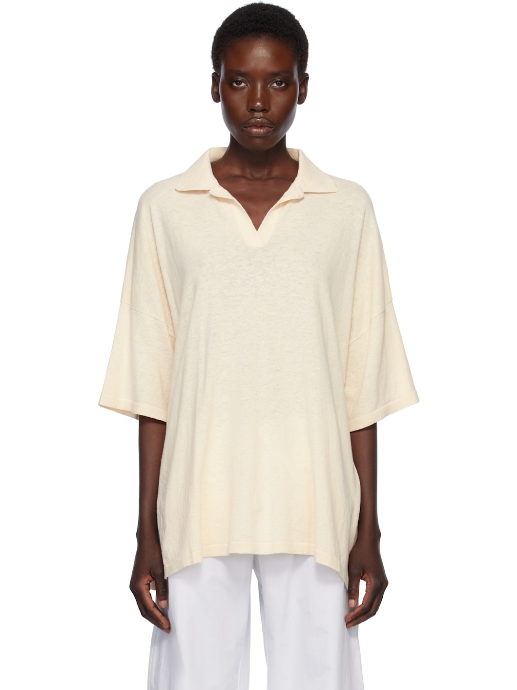 Knit pima cotton- and linen-blend polo. · Rib-knit open spread collar and cuffs · Vented side seams · Dropped shoulders Supplier color: Ivory 70% pima cotton, 30% linen. Made in Peru 252874F108000