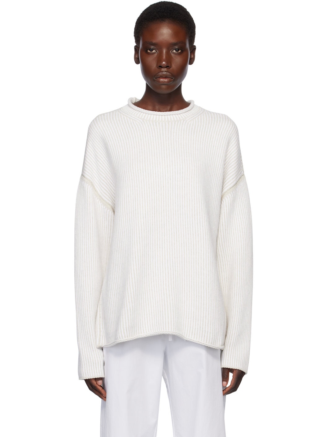 Hand-loomed knit pima cotton sweater. · Hand-dyed · Rolled edge at crewneck, hem, and cuffs · Vented side seams · Dropped shoulders Supplier color: Marble/White 100% pima cotton. Made in Peru 252874F096000