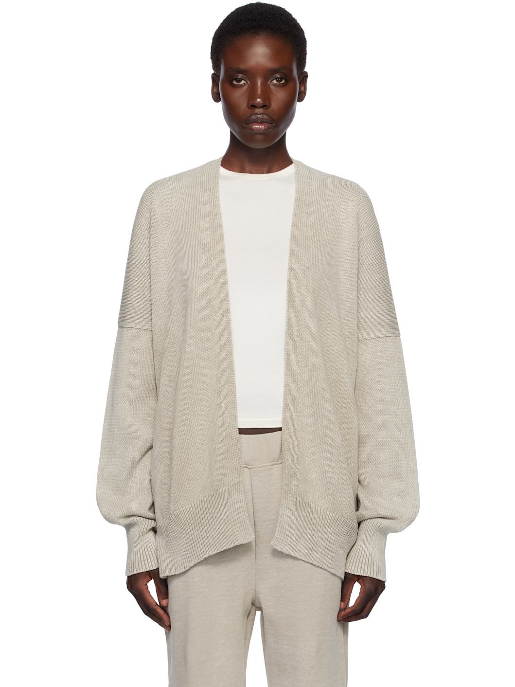 Hand-loomed knit pima cotton cardigan. · Open front · Rib-knit hem and cuffs · Vented side seams · Dropped shoulders Supplier color: Washed clay 100% pima cotton. Made in Peru 252874F095003