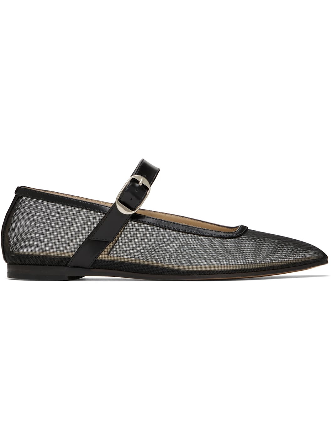 Handcrafted sheer mesh Mary Jane-style ballerina flats in black. · Square toe · Pin-buckle strap at vamp · Patent leather trim at collar · Logo embossed at padded calfskin footbed · Stacked leather heel with rubber injection · Leather sole Supplier color: Black Upper: textile, leather. Sole: leather, rubber. Made in Italy 251226F118022