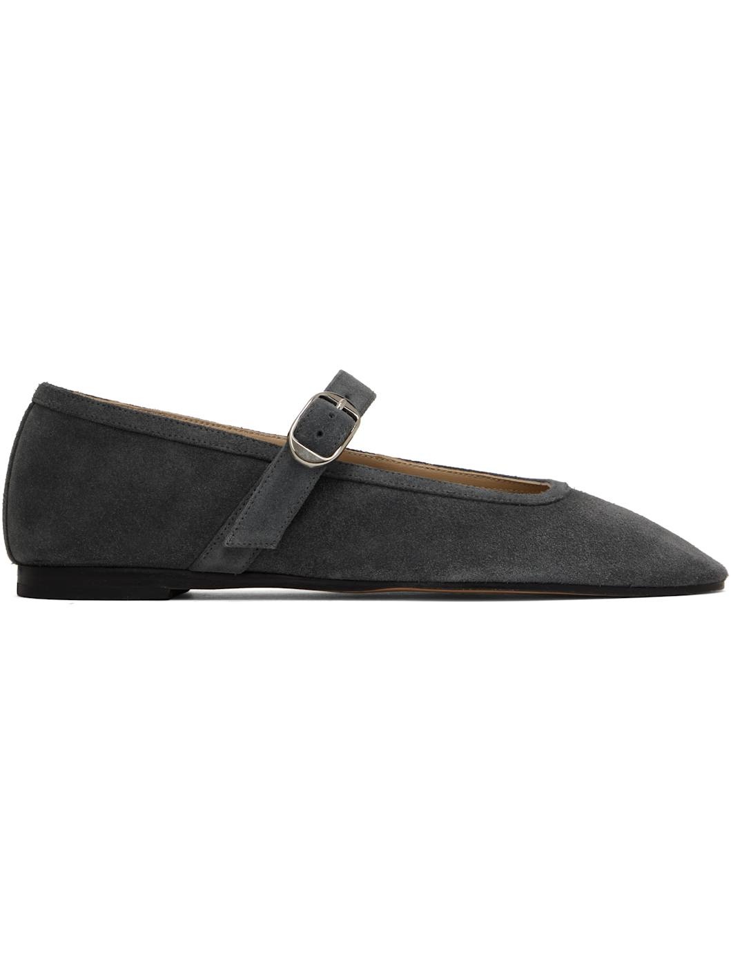 Handcrafted suede Mary Jane-style ballerina flats in gray. · Square toe · Pin-buckle strap at vamp · Logo embossed at padded calfskin footbed · Stacked leather heel with rubber injection · Leather sole Supplier color: Anthracite suede Leather. Made in Italy 251226F118025