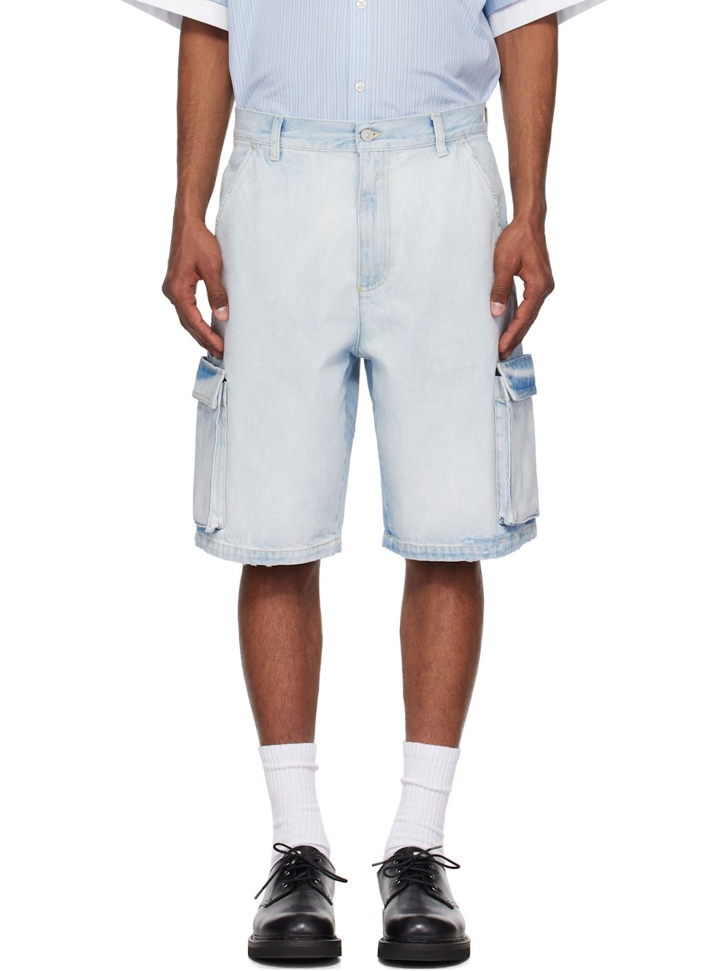 Washed non-stretch denim shorts. Fading and subtle distressing throughout. · Belt loops · Four-pocket styling · Zip fly · Cargo pocket at outseams · Faux-leather logo patch at back waistband · Contrast stitching in yellow · Logo-engraved silver-tone hardware Supplier color: Faded blue 100% cotton. Made in Italy 251215M193001