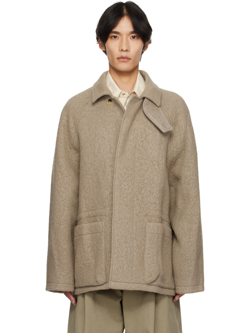 Brushed wool- and alpaca-blend fleece jacket. · Detachable throat guard at stand collar · Concealed button closure · Patch pockets at front · Concealed drawstring at waist · Raglan sleeves · Full satin twill lining Supplier color: Gray Body: 65% wool, 25% nylon, 10% alpaca. Lining: 100% polyester. Pocket lining: 65% polyester, 35% cotton. Made in South Korea 252495M180001