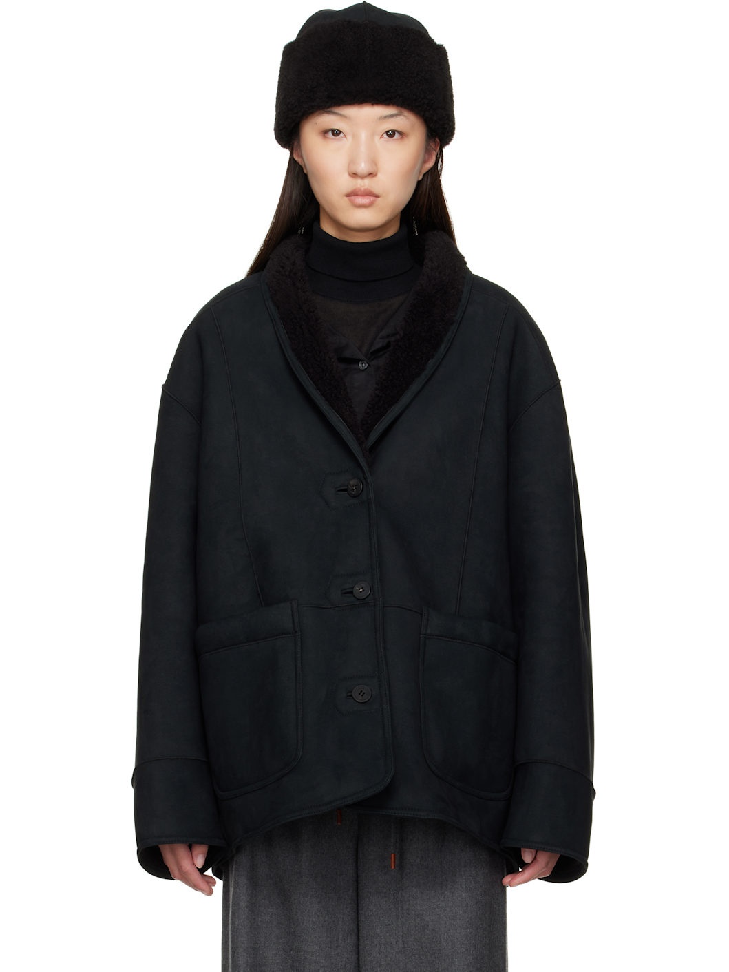Reversible faux-suede jacket. Reverse in black faux-shearling. · Shawl collar · Button closure · Patch pockets · Dropped shoulders Supplier color: Black Body 1: 60% polyester, 30% wool, 10% polyamide. Body 2: 100% polyamide. Made in South Korea 252495F064001