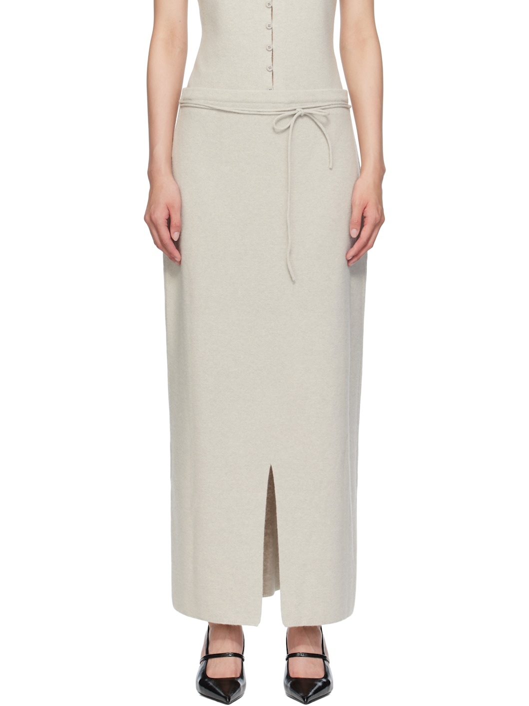 Brushed rib-knit wool-blend maxi skirt. · Detachable drawstring at elasticized waistband · Central slit at hem Supplier color: Gray 65% wool, 26% nylon, 9% cashmere. Made in South Korea 252495F092002