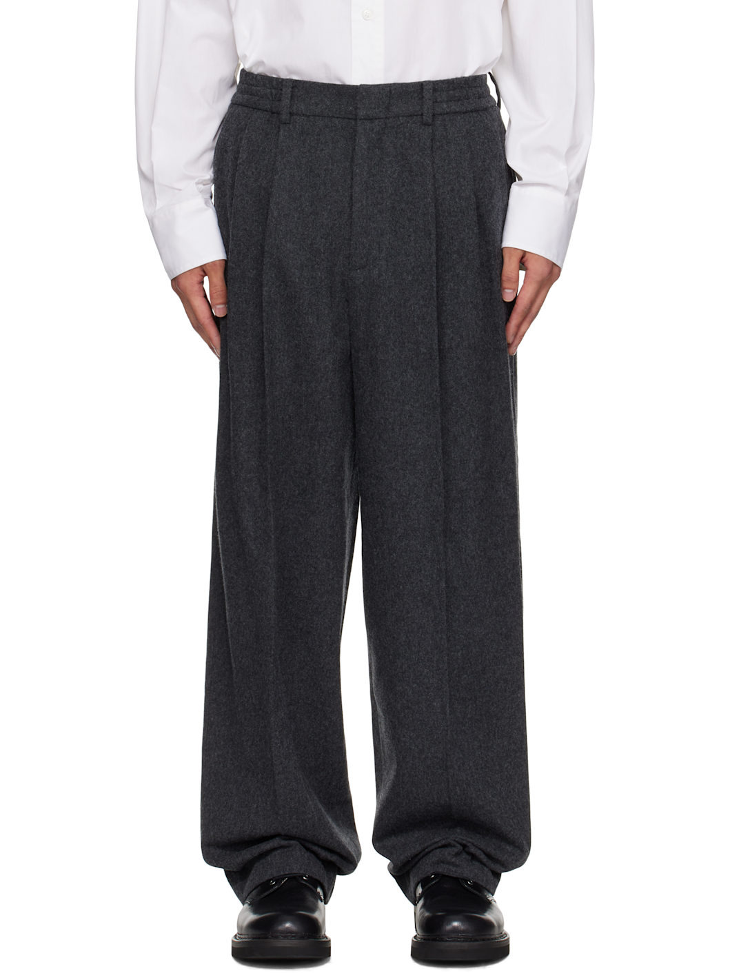 Wool melton trousers. · Belt loops at elasticized waistband · Four-pocket styling · Zip fly · Pleats at front · Creased legs Supplier color: Gray Body: 100% wool. Pocket lining: 80% polyester, 20% cotton. Made in South Korea 252495M191002