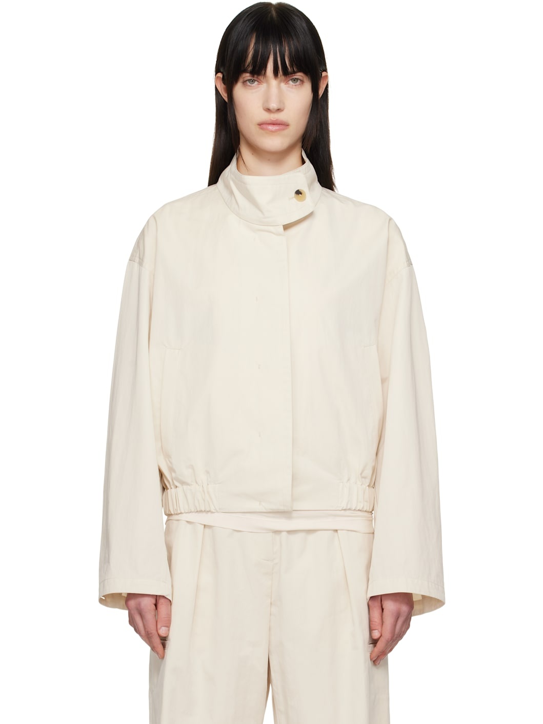 Cotton- and nylon-blend twill jacket. · Button fastening at funnel neck · Concealed button closure · Welt pockets · Elasticized hem · Dropped shoulders · Button-fastening at cuffs · Storm flap at back yoke · Unlined Supplier color: Ivory Body: 66% cotton, 34% nylon. Lining: 100% cotton. Made in South Korea 251495F058000