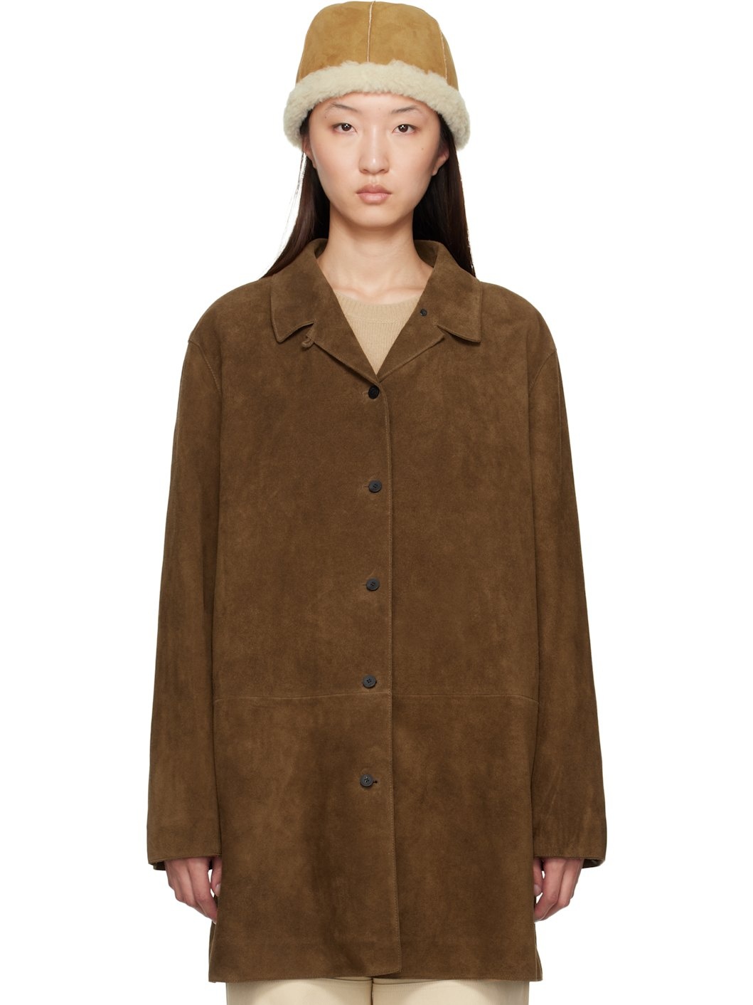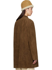 Suede jacket. · Button tab at spread collar · Button closure · Welt pocket at interior · Full twill lining Supplier color: Brown Body: 100% leather. Lining 1: 100% polyester. Lining 2: 65% polyester, 35% cotton. Made in South Korea 252495F064002
