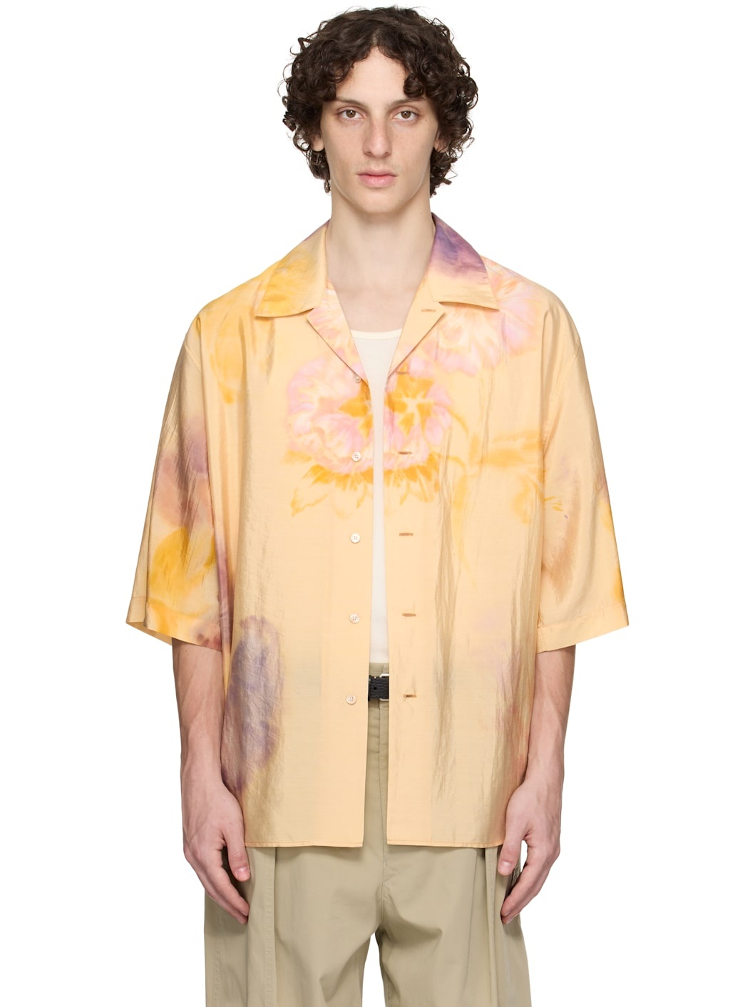 Crinkled silk- and nylon-blend sateen shirt. · Graphic pattern printed throughout · Spread collar convert to stand collar · Button closure · Droptail hem · Corozo hardware Supplier color: Light peach/Mauve/Ochre 76% silk, 24% polyamide. Made in Portugal 251646M192016