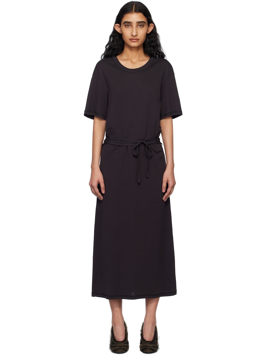Cotton jersey midi dress. · Rib-knit crewneck · Detachable self-tie belt · Dropped shoulders Supplier color: Squid ink 100% cotton. Made in Portugal 251646F054003